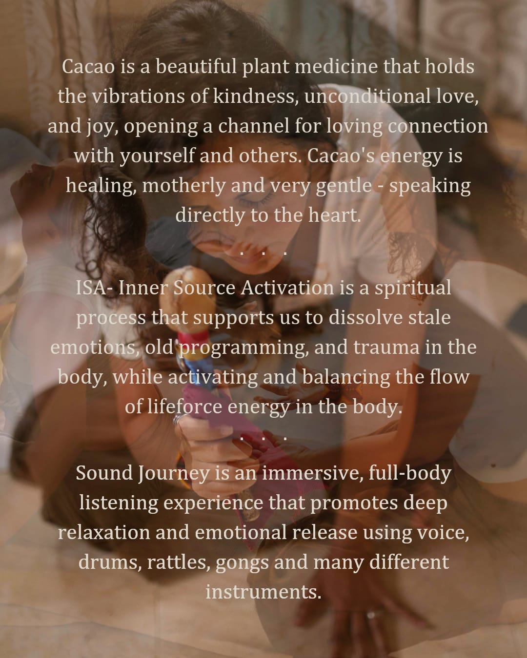 An intricate tapestry intertwining the nurturing guidance of Mama Cacao heart medicine, the calming resonance of sound healing instruments, and the potency of Inner Source Activation – a spiritual journey that dissolves armor and stagnant energies, unlocking the potential for self-healing and reconnecting with the innate wisdom residing within every cell of your being.